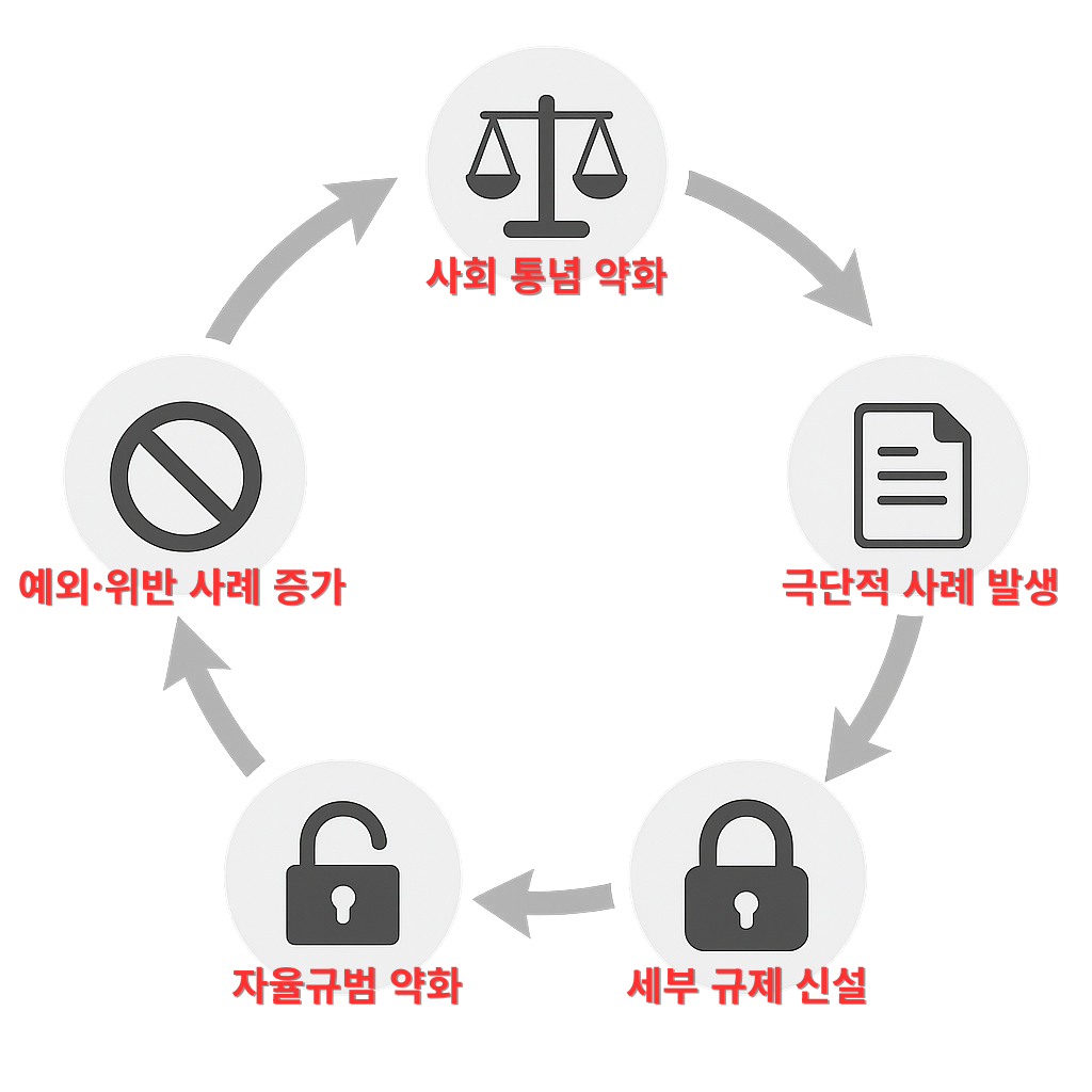 상식적 자율 → 극단적 사례 발생 → 규제 신설 → 상식 약화 → 규제 확대의 순환 구조다.