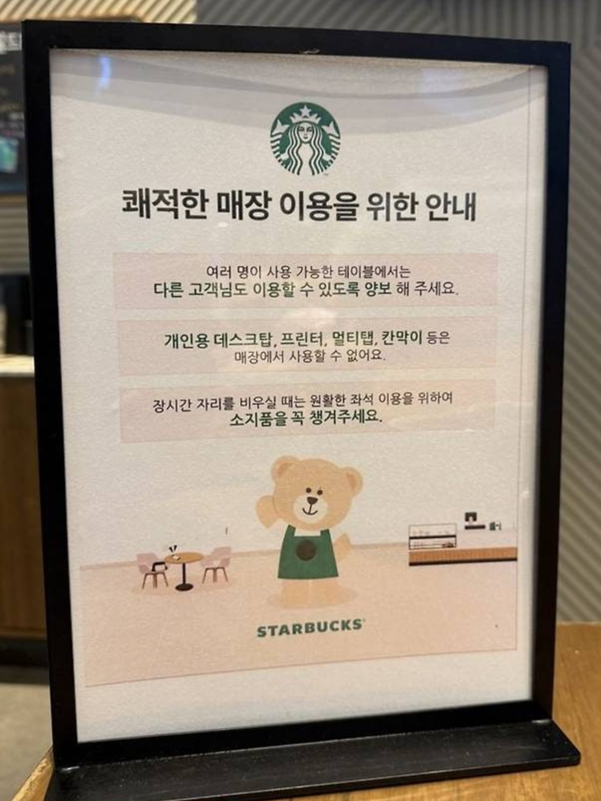 최근 스타벅스가 데스크톱, 가림막, 멀티탭, 프린터 사용을 공식적으로 금지한다고 공지했다.